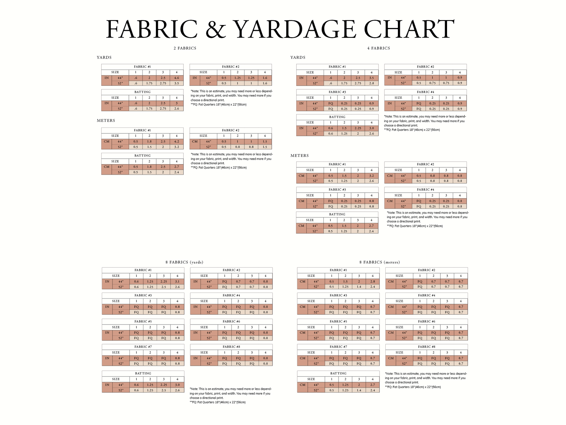 - For yardage see chart (in photos)